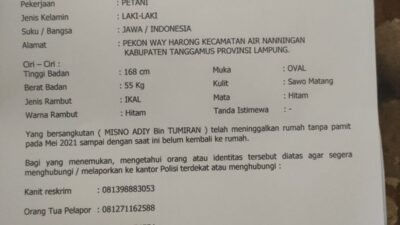 TANGGAMUS – Kepolisian Resor Tanggamus mengungkap identitas seorang warga Kecamatan Air Naningan yang dilaporkan menghilang…