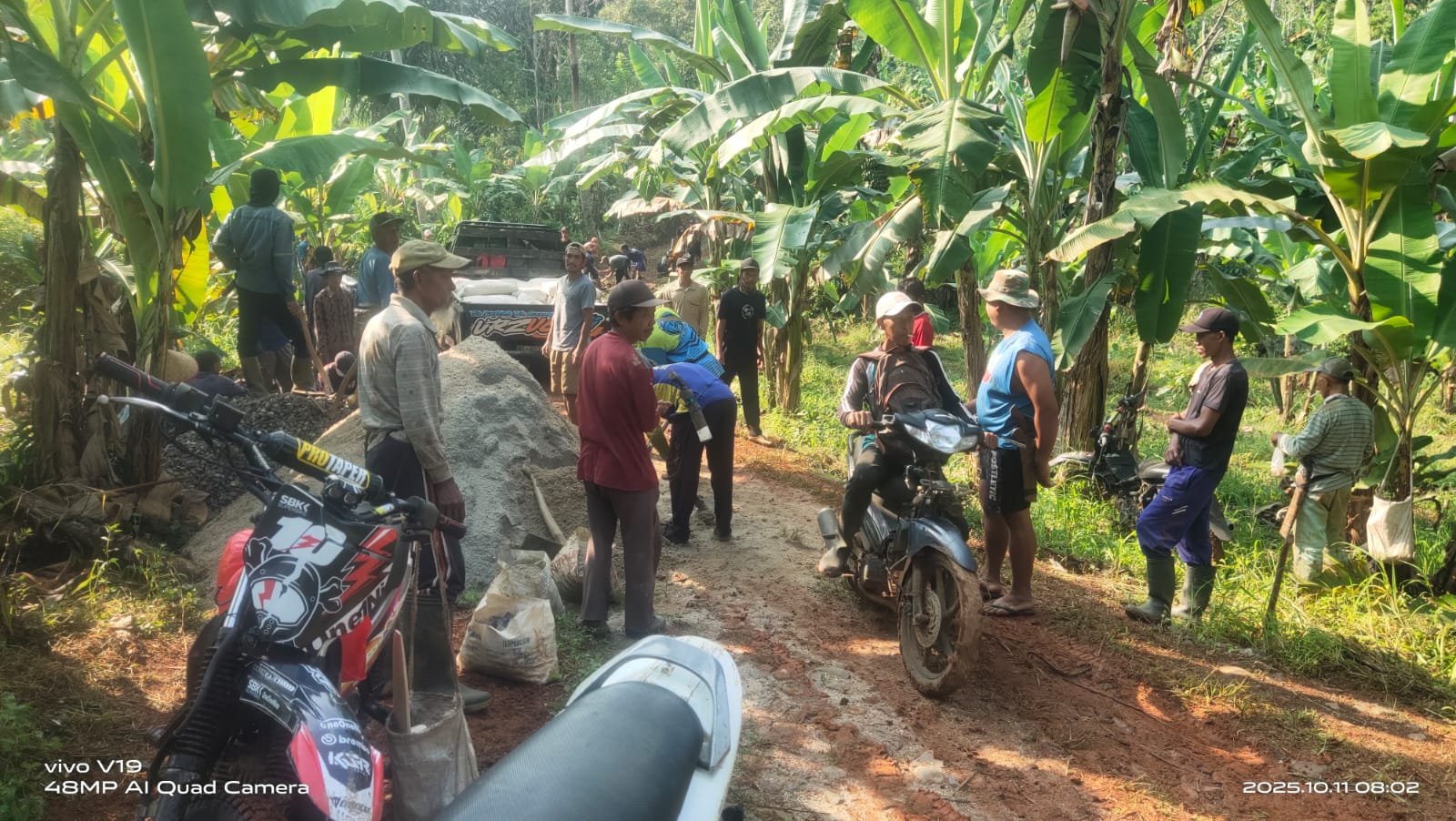 TANGGAMUS — Para Wali Murid bahu-membahu dalam kegiatan Gotong-Royong Pengecoran Jalan menuju Sekolah SD Negeri 1 Sinarjawa. Sumber Dana kegiatan itu, dihimpun warga setempat dengan cara berswadaya. Sabtu, (11/10/2025).